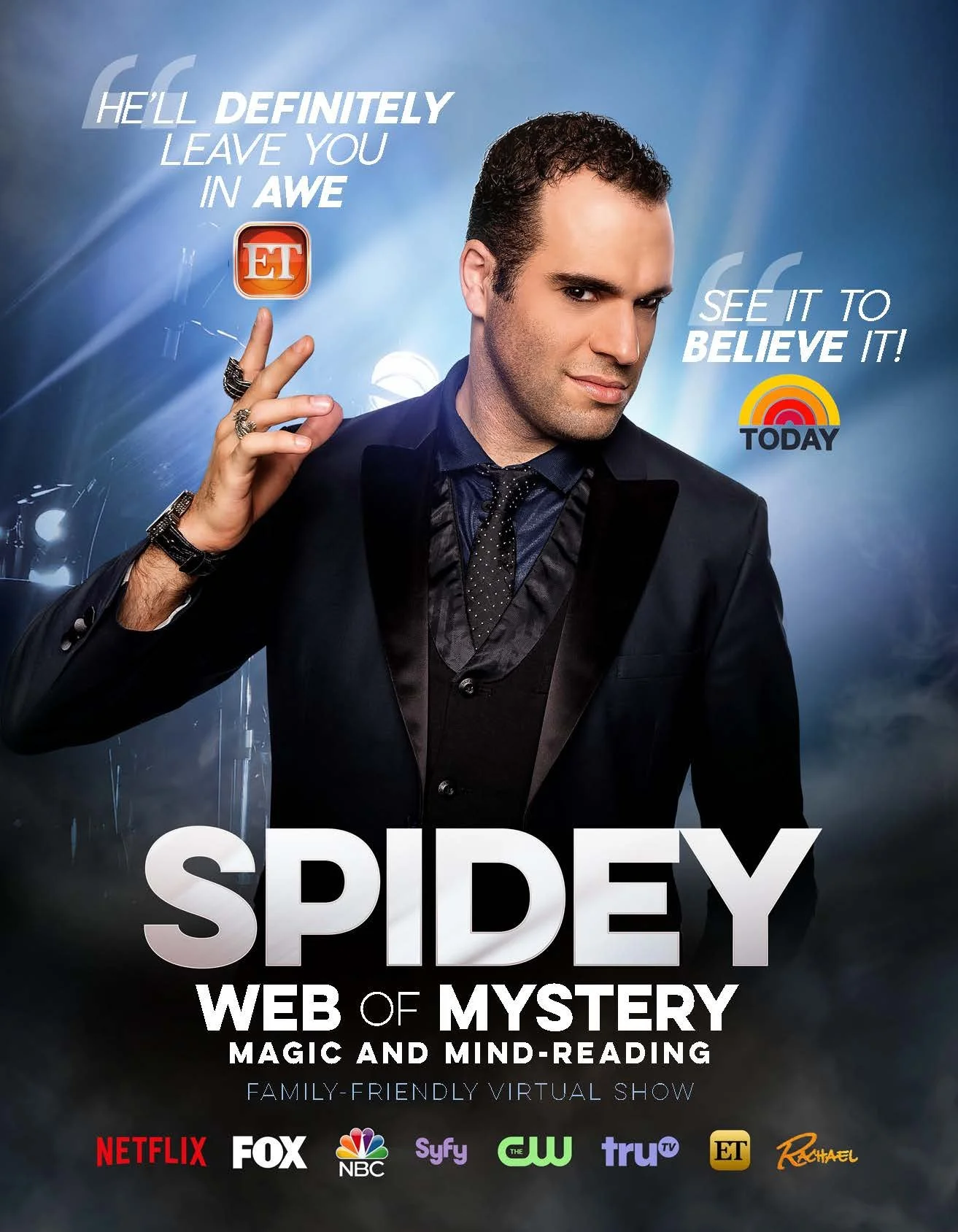 A U.S. Mentalist of the Year, Spidey has appeared on TV numerous times, including NBC’s Today, CW’s Masters of Illusion, Netflix’s Brainchild series, FOX’s Showtime at the Apollo (a competition finalist), Discovery, Entertainment Tonight, SyFy, TruTV, and international TV shows.